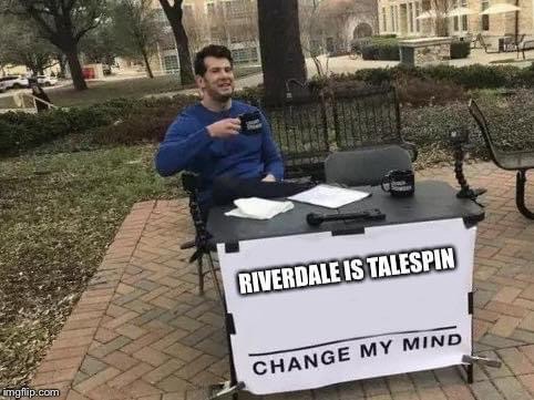 —-I know of many nostalgic cash-ins, of which even the worst examples at least bare some semblance to their source material. But I can only think of one other example besides Riverdale that borrowed so very much from an original source only to mangle it into a mere shadow of its former self. Of course here I refer to Disney’s use of the beloved Rudyard Kipling characters in the show Talespin. Here we have Baloo the bear cast as a seaplane pilot for a delivery service. Clearly the bare necessities weren’t putting enough pawpaws and prickly pears on the table.