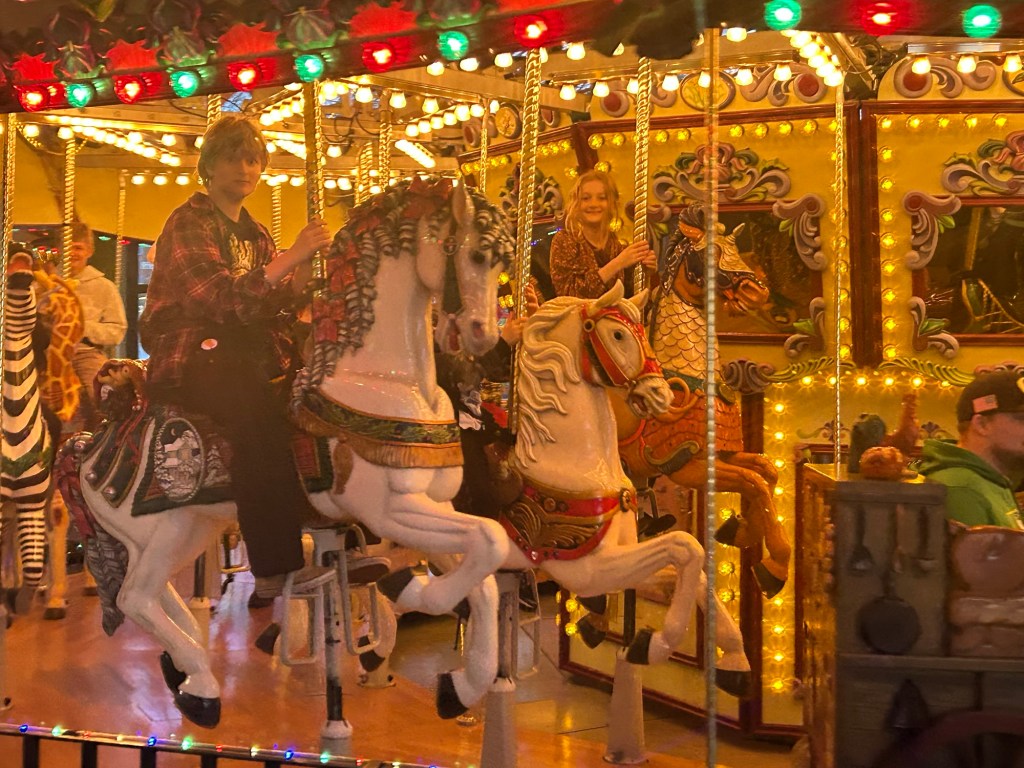 We exchanged a few gifts and hugs and parted ways with extended family members, some wanting to go home and others quite famished and craving Love Love’s Teriyaki; a craving we eventually sated but not before visiting the Salem Carousel and walking the nearby Christmas light display. As I watched the youngest of my older three happily ride the carousel while the middle of my older three stood beside me, I couldn’t help but wonder if this might be the last time she would ride this for awhile until her innocent sense of wonder should return again someday.  Right now the burden of identity and what others think of them weighs heavily as they figure out who they want to be. It was a while before I myself threw my cares to the wind and decided to be who I wanted to be. Even still, it sometimes takes a flamboyant man in yellow tights to coax me into being less Walter Hobbs and more Buddy the Elf.