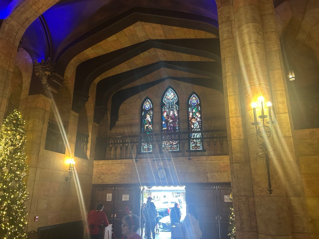 Before we could get our picture with Buddy however, we found ourselves suddenly inundated with a gaggle of Buddies and Jovies! A veritable troop of theater goers all dressed in respective costumes swarmed the entrance. The official Buddy was ecstatic. Strangely, I felt rather out of place dressed in my very monochromatic Star Wars Holiday sweater. To think, I was afraid of being overly festive. Here I was now surrounded by  Christmas elves. I’d seen pride parades with less color.