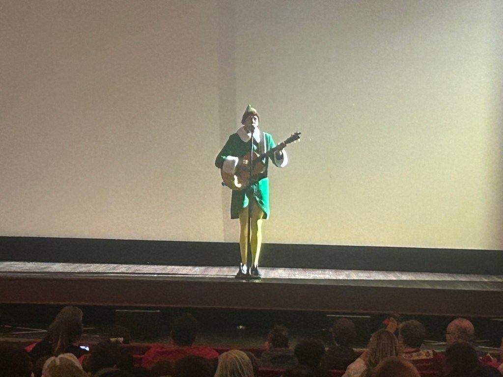 Finally the moment had arrived but not a movie did roll but a figure there was on the stage, tall and green. It was Buddy! The same from before! He led us in a couple of Christmas carols with his guitar. I didn’t know Buddy could play guitar but here he was doing it! And everyone EVERYONE sang along. It was, as they say, a hot crowd.