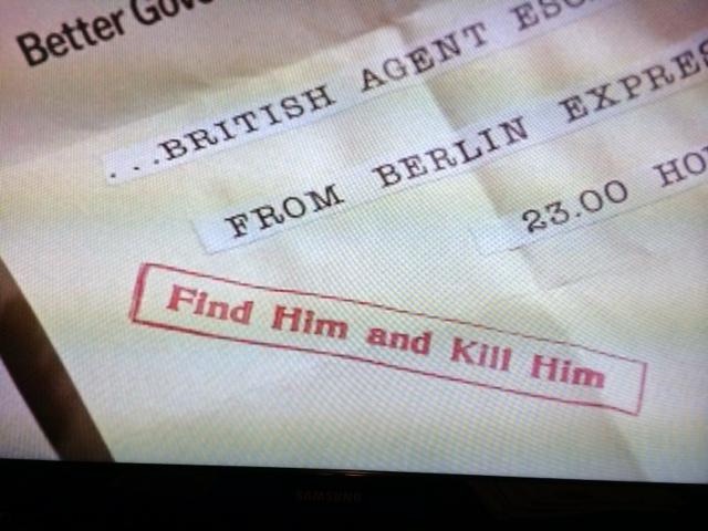 Right off the bat, a German soldier addresses an officer. When the soldier removes his helmet his chinstrap remains under his chin. The officer observes the papers brought to him and stamps them with a ready-made stamp that reads “Find him and kill him!” They have a stamp for that! I guess that’s necessary when you find yourself writing those specific words a lot.
