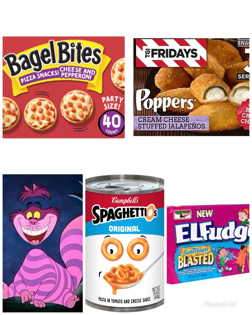 Hmmmmmmmmm. Duuuuuuuude, I could totally go for some pizza bagel bites, spaghetti-O’s, cream cheese jalapeño poppers, and a bag of butterfinger E.L. Fudge cookies right now!