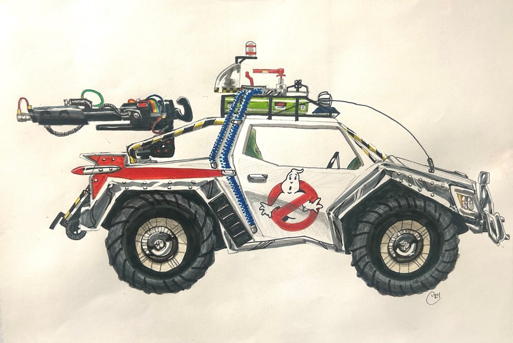 The splotch of green slime on the hood vent sells the whole thing for me though. It was a fun way to say “Slimer was here” without drawing Slimer. I wanted the cars to demonstrate what inspired them without the presence of characters. However I did make an exception…