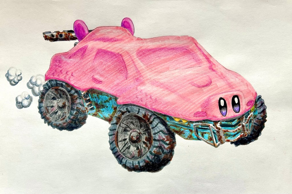 My kids enjoy a game called Kirby in the Forgotten Land. Kirby is a character who can inhale things and then take on characteristics and abilities of that thing. Here we see Kirby inhaling a whole car. Not something you see everyday. My son requested the Kirby version and by now you know I rarely refuse the idea of a kiddo so here we go: