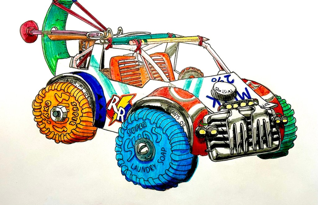 [I recently watched a docuseries pertaining to a particular producer of neon colored school supplies (which shall go unnamed here) and have therefore decided to withdraw one rather nostalgic vehicle design from this post because my opinion of said producer has changed drastically and I refuse to promote, encourage, or pay homage to them or display anything with their name on it. GOOD DAY, SIR!]