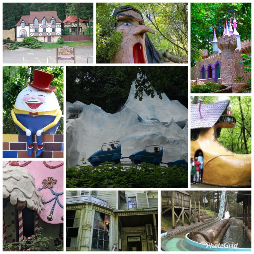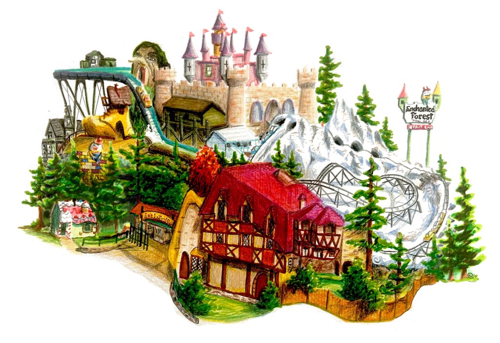 From left to right, top to bottom, we have the half-timbered fairy-tale exterior, the witch slide, the castle, humpty-dumpty, Ice Mountain Bobsled ride, the Old Lady Who Lived in a Shoe slide, The Ginger Bread House, the Haunted House, The Big Timber Log Ride.