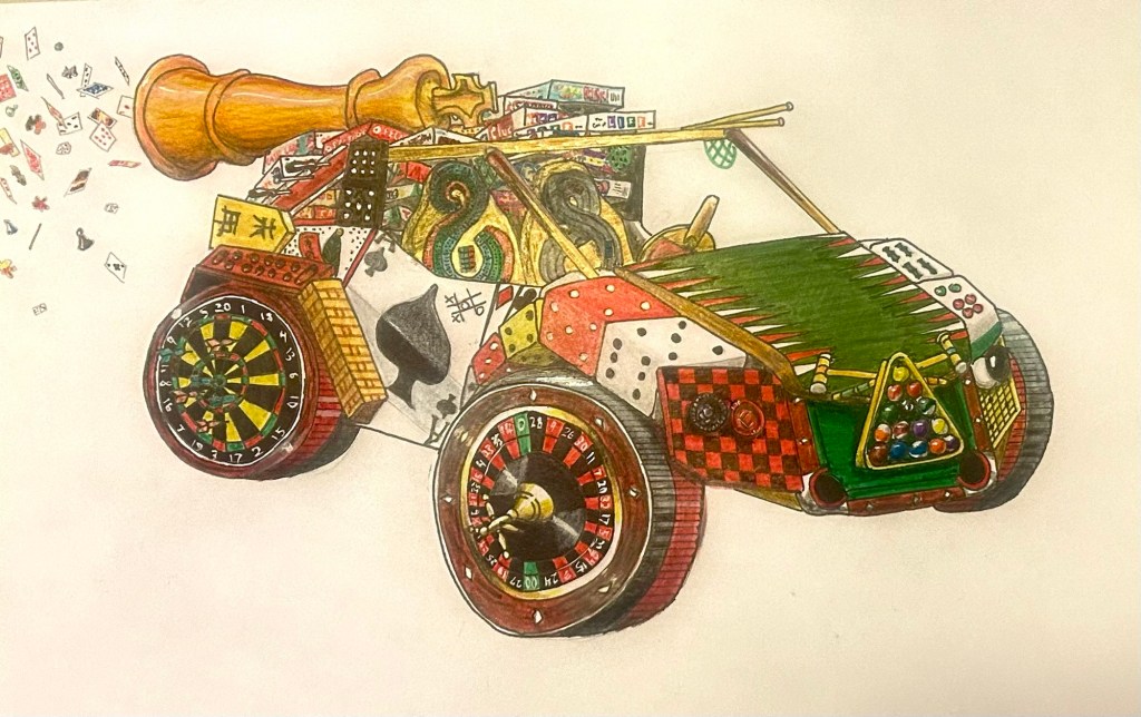 This first piece (cover art and above) started at a request from my fourth daughter. She loves board games and wanted to see a board game vehicle. I loved the idea and couldn’t wait to get started. I conceived the idea of constructing every single piece of the vehicle from some kind of board game element. There’s not a single remnant of the original vehicle here, granted I might have stretched a bit with billiards and croquet which might not be boardgames per sé. I just like Billiards and Croquet.