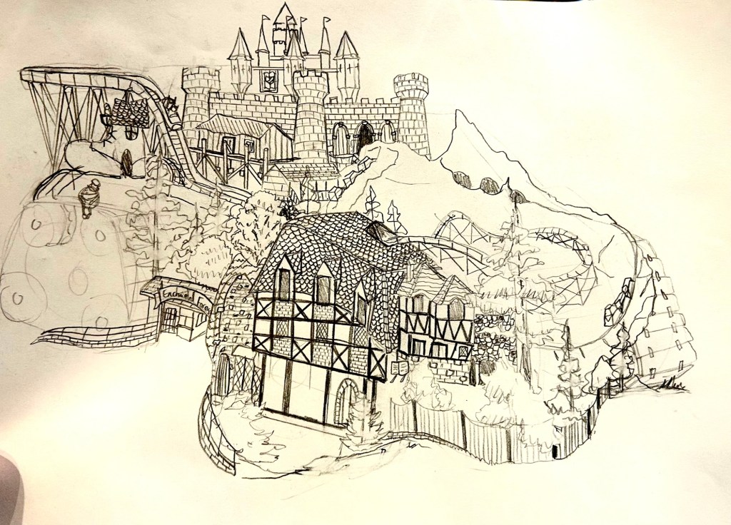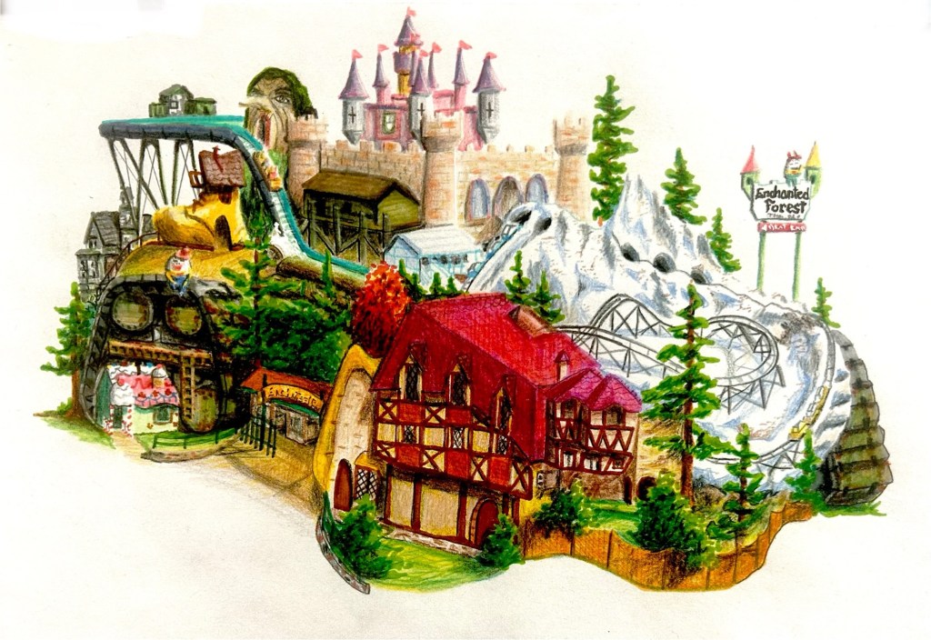 Finally, we have a big one here. My son suggested an Enchanted Forest version. Enchanted Forest is a theme park just outside of Salem, Oregon. I loved the idea of a huge mobile theme park similar to the mobile cities you might see in the film “Immortal Engines”. This is what I came up with: