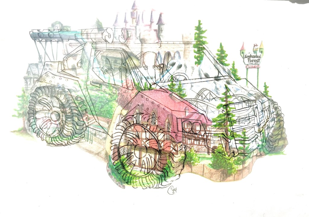Well, just on a whim I sent this to the operators of the Enchanted Forest and they LOVED the artwork. They offered to buy it! They wanted to put it on shirts and stuff. Naturally, I agreed. The wanted to cover up the tank treads though, which made sense to me so I happily accommodated the request.