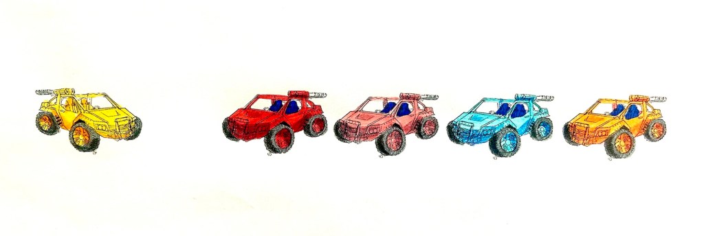 Before we look at the last one today, I want to show you a funny little experiment I did. The following are basically a color test. I printed the original vehicle in this formation and colored them (rather crudely) just to see how they would look. The vehicles were quite small on the page, so coloring them by hand was sloppy. I don’t know that I will ever do full sized versions of these. The novelty of seeing them like this is enough. Though I do have a couple more ideas for these “team” shots.