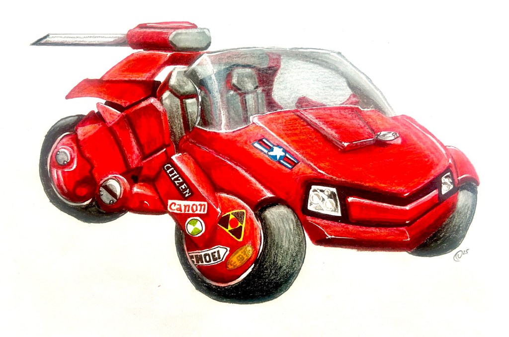 The 80’s anime “Akira” would be my next target. It was fun taking the famous Nasuko-Cycle and widening it into a two-seater car. I also enjoyed bringing out the shape on just red. That was an interesting challenge akin to the “Kirby and the Forgotten Land” vehicle. This one had sharper edges though. The trademark stickers depicted are actually from the left wheel-fork cover but the stickers on the opposite side are less iconic in my opinion so I cheated a bit and put the decals on the opposite wheel-fork cover.