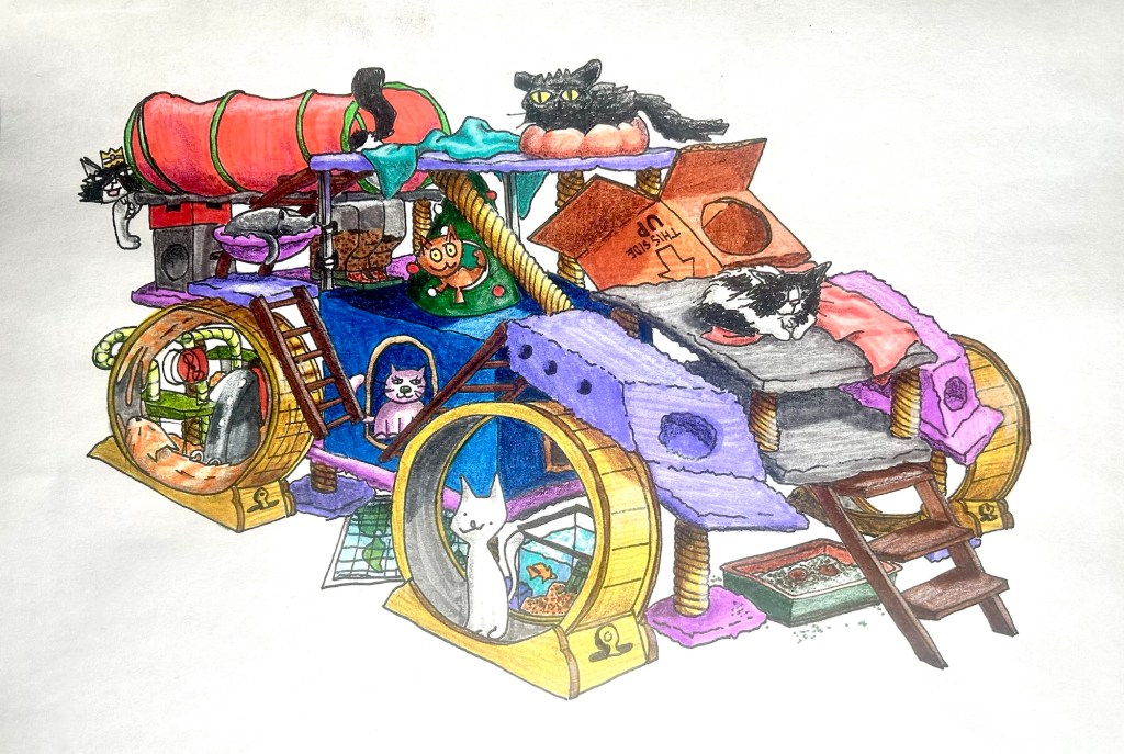 This next one (above) is another favorite of mine, particularly because my whole family got involved. Each kid drew a cat. Some drew more than one. Even my wife chipped in (Though she insists she can do better and was simply scratching it off quickly because she was busy. I believe it. She is busy and I’ve seen her other artistic endeavors.) I wasn’t concerned with the quality of the kids’ (and wife’s) art work, just so long as it was them doing it. So we have a total of nine cats here. Can you spot them all? No, the one in the tube is not elongated. The black and white cat on the hood is our actual cat, Arwen. The Russian-Blue is my old cat Inga.