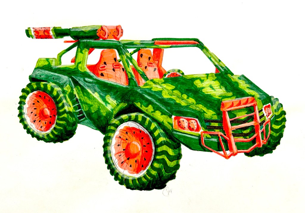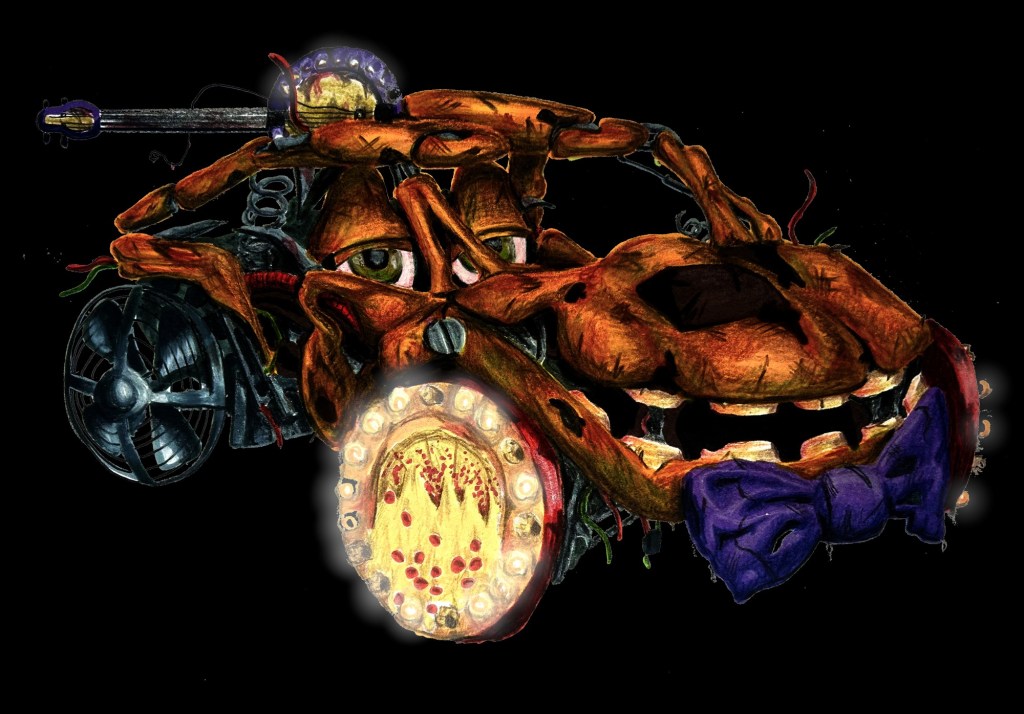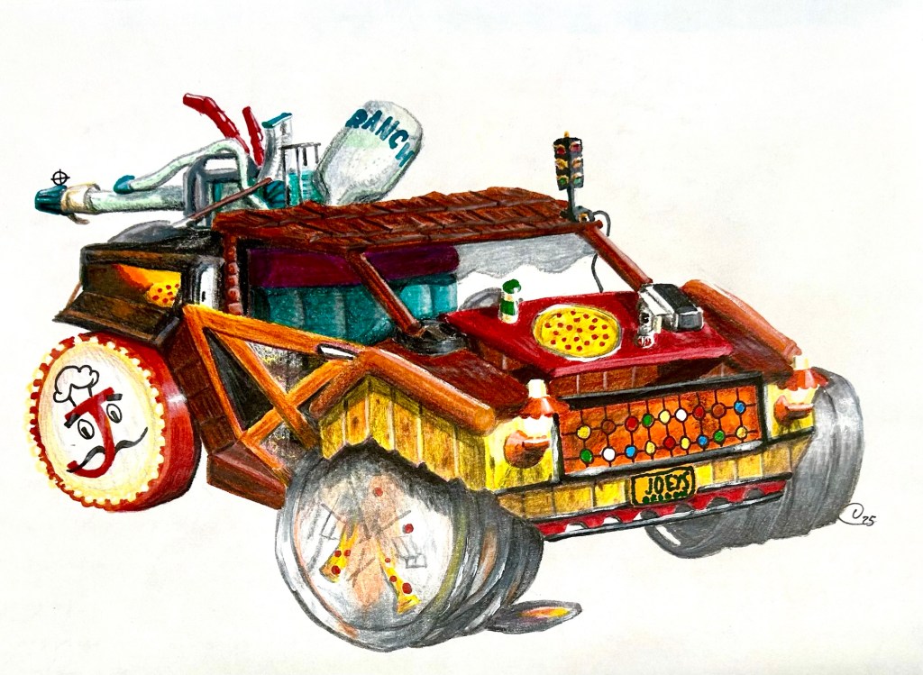 Bonnie is not a car in the game. Bonnie is a murderous pizza parlor animatronic. Some have concluded this car is supposed to be representative of Freddy himself, an animatronic bear. But my kid assures me the bow tie and banjo are tell tale trademarks of Bonnie. It’s hard to tell but the roof is patterned after segmented animatronic rabbit ears. Definitely not a bear. The back wheel is a fan that is in just about every installment of the game. The lighted sign with the melting pizza was my own creation. I just felt it needed some connection to pizza. To help the glowing effect, this one got some work done in the computer. No AI was used. I can’t stress that enough. Just regular computer tools, done by my own hand to create a black background and a glow.