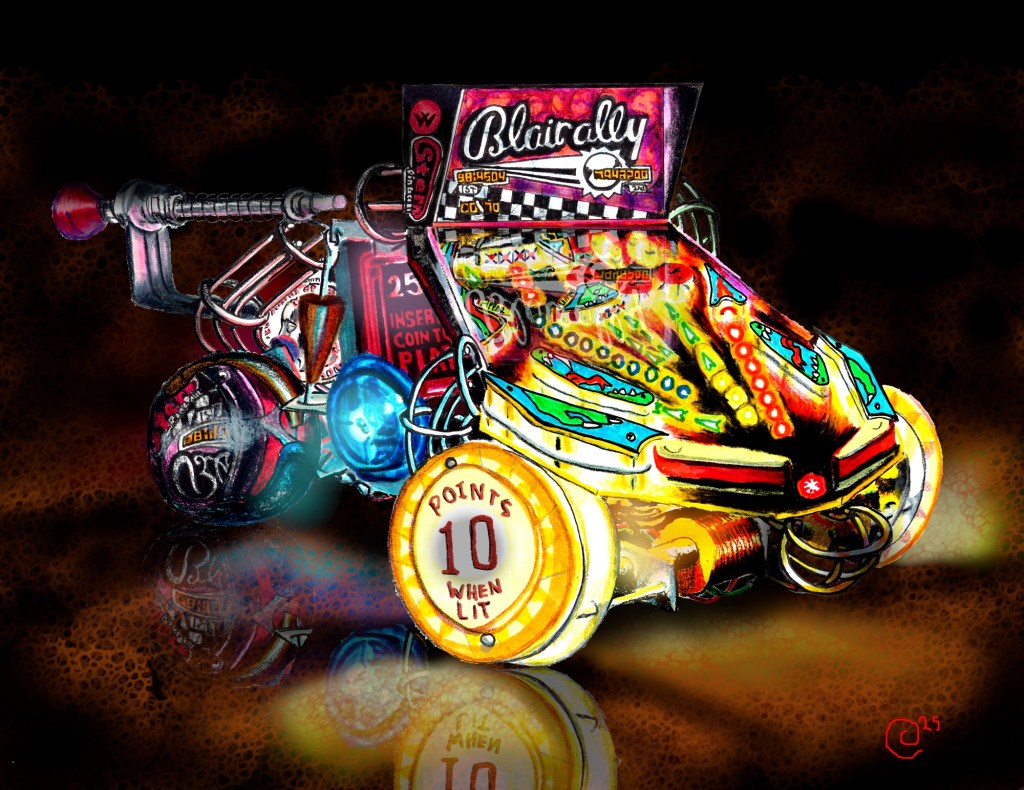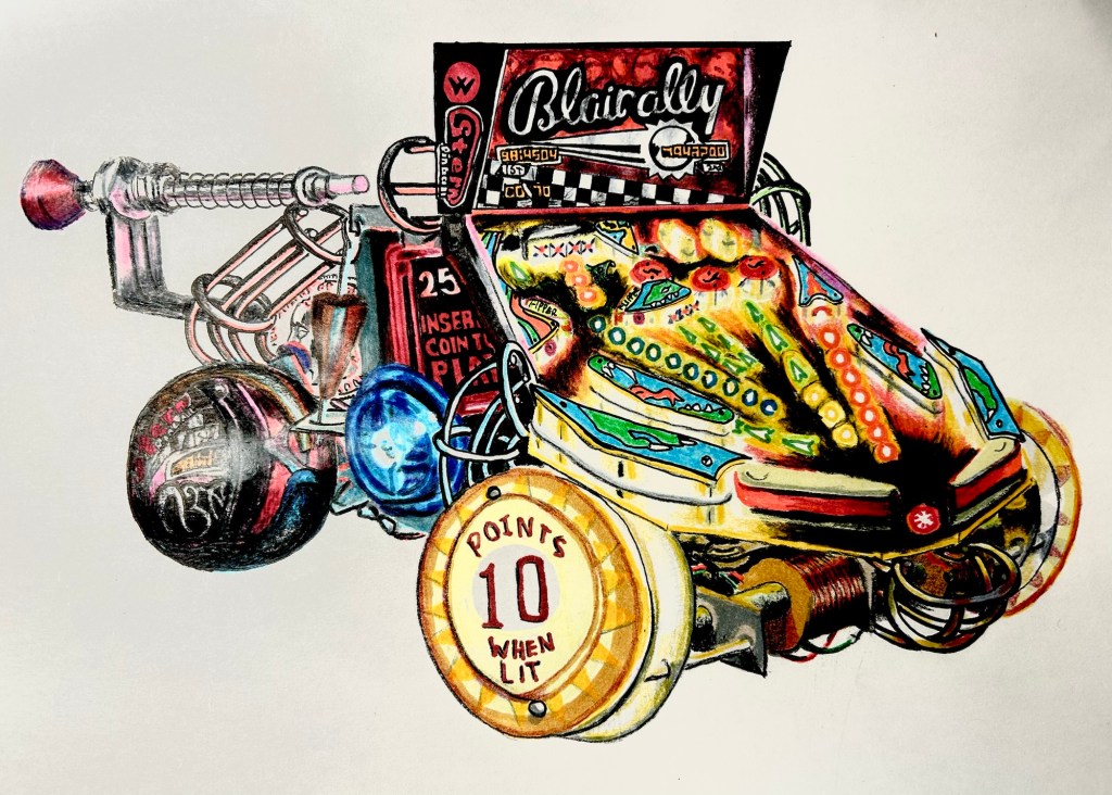 The “back wheel” pinball is a five point perspective reflection done to the best of my ability. I watched a two hour tutorial on how to do it right but that was for a reflective ball inside a room not next to an imaginary pinball machine shaped like a car. So you get what you get.